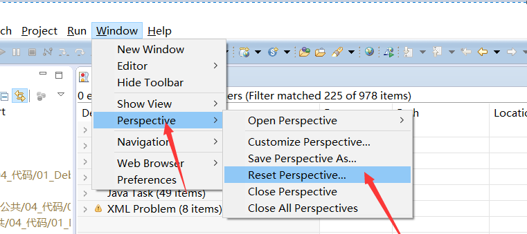 4、點(diǎn)擊之后,在下拉的菜單中選擇Perspective--Reset Perspective,如圖:
