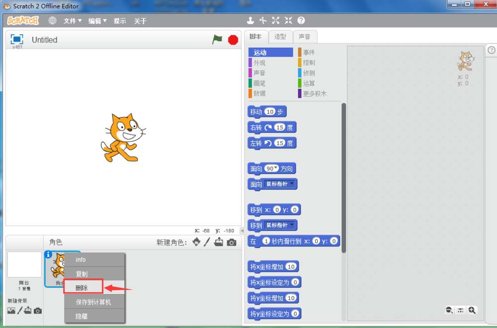 2、在小貓上按右鍵,點擊刪除,將小貓刪除掉;
