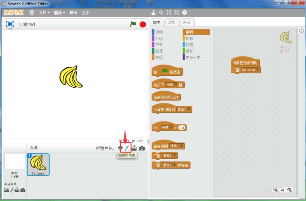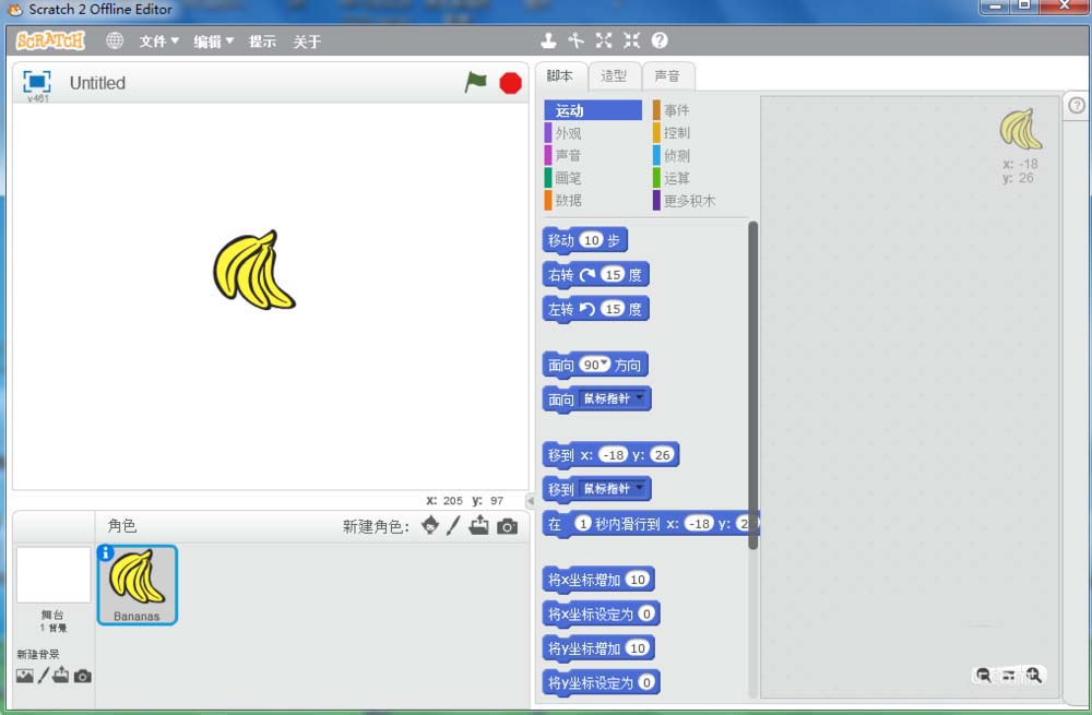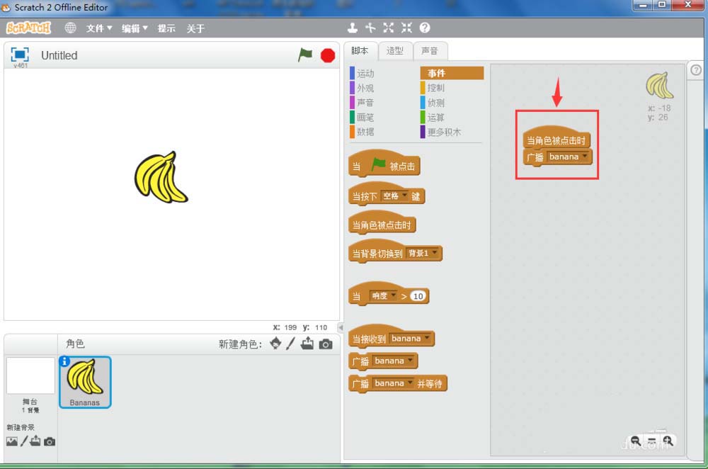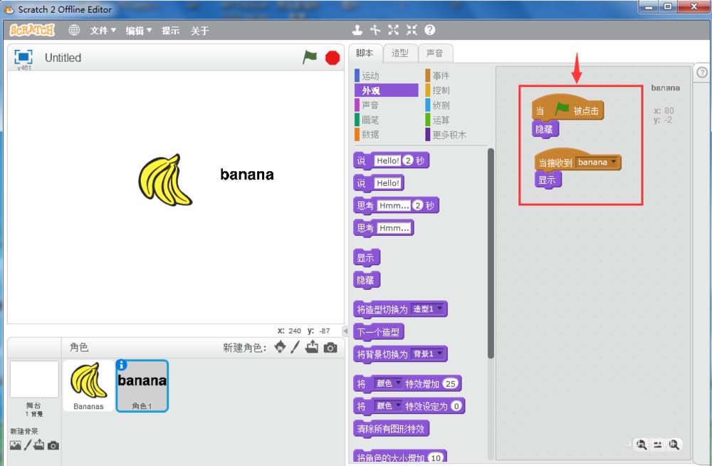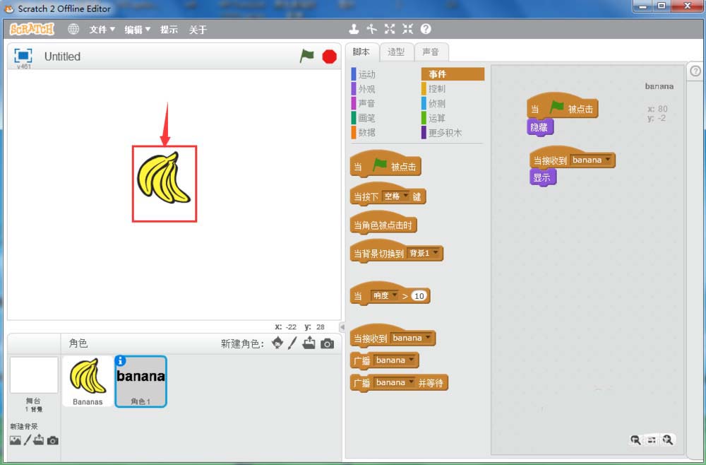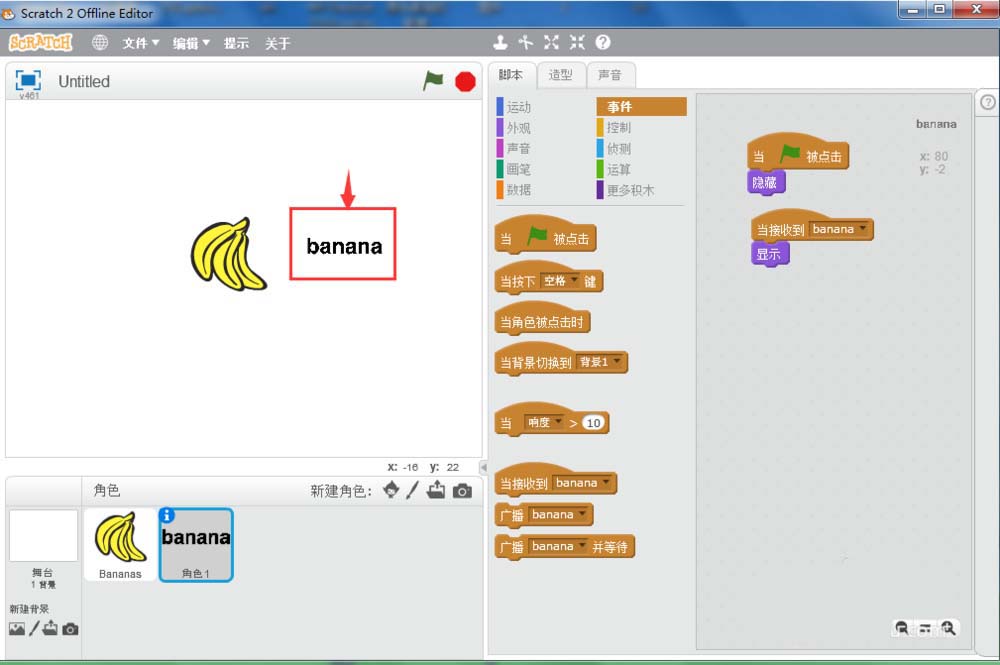 以上就是scratch制作點擊香蕉圖片出現香蕉英文小程序的教程,希望大家喜歡,請繼續關注武林網。