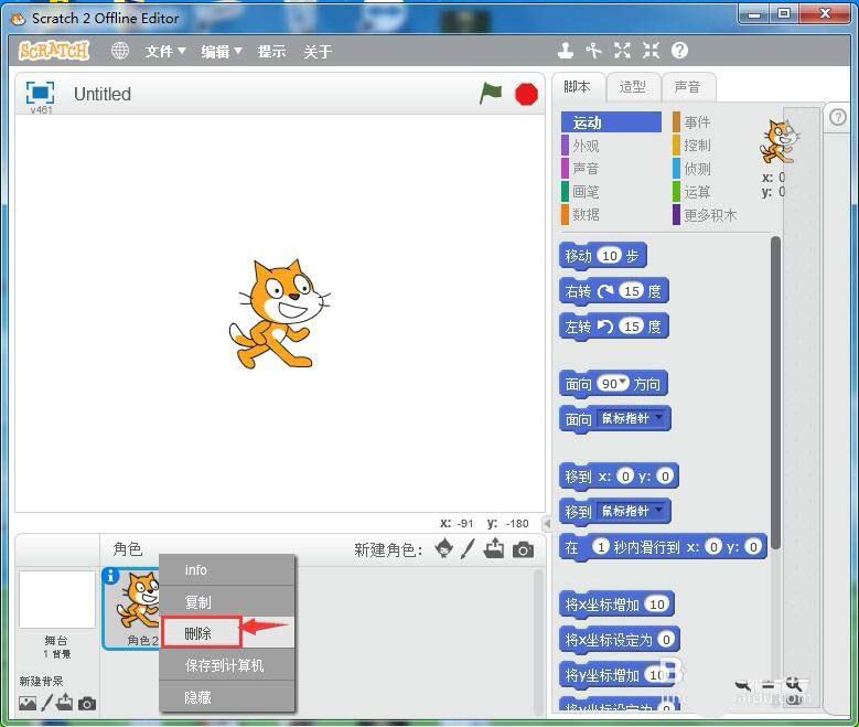 2、在小貓上按右鍵,點(diǎn)擊刪除,將小貓刪除掉;