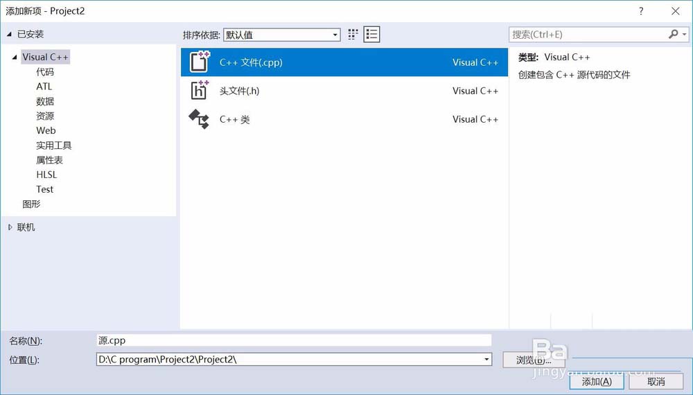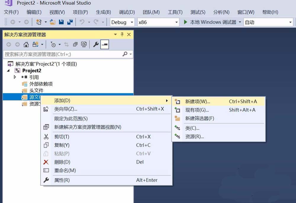4、將鼠標放置在屏幕左側的“源文件”上,點擊右鍵,彈出菜單欄,選擇“添加”->“新建項"。