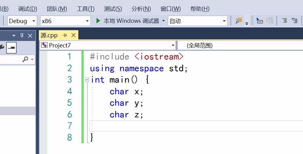 8、在編輯器中創建三個字符型變量x、y、z,用來存儲操作數