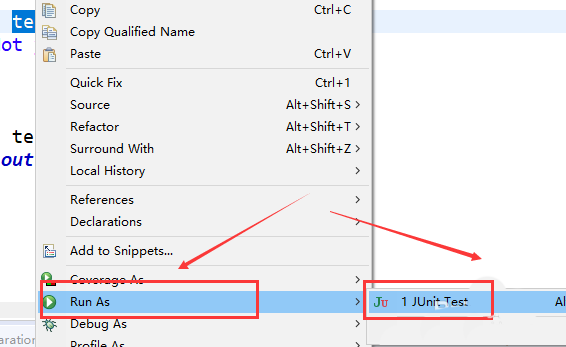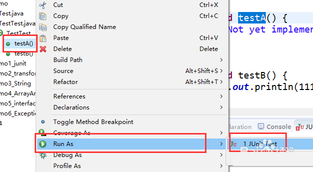 然后選擇測試方法,右鍵單擊 Run As -> Junit Test。