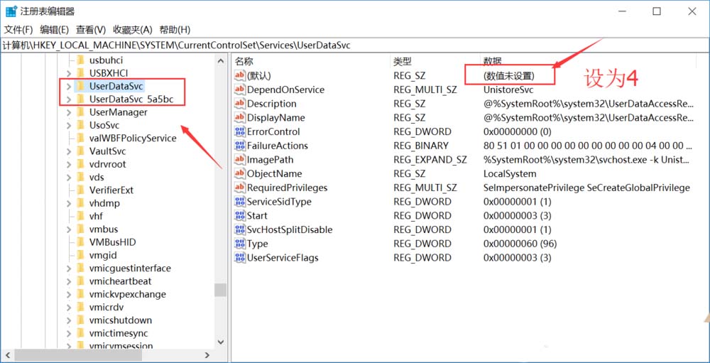 6、在service欄位下分別找到OneSyncSvc、OneSyncSvc_Session1、UserDataSvc、UserDataSvc_Session1這四個(gè)選項(xiàng),將start值改為4,重啟windows即可,如下圖所示
