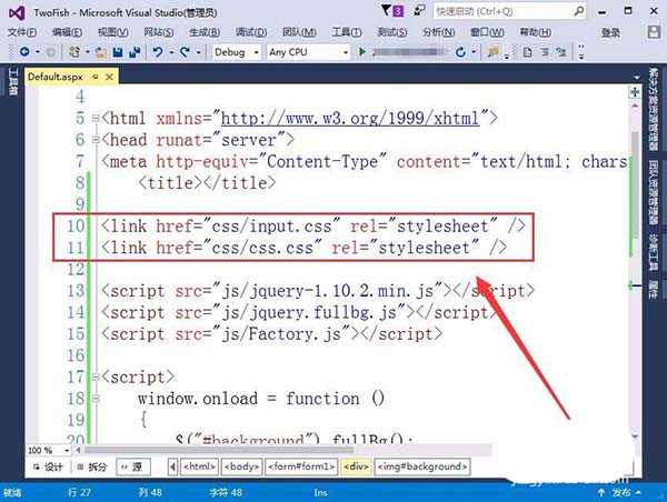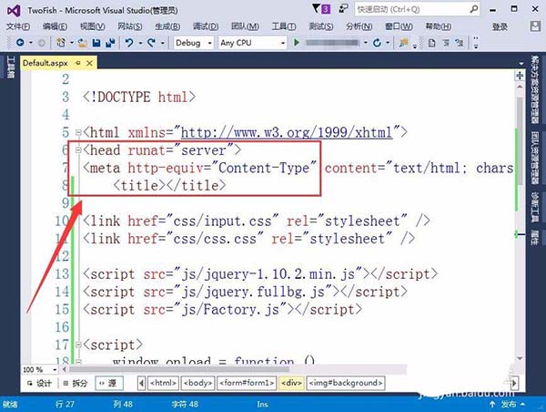 1、首先,Visual Studio打開一個網(wǎng)站,本例為TwoFish,在網(wǎng)站中已放置了圖片資源,以及需使用的css樣式和js代碼。