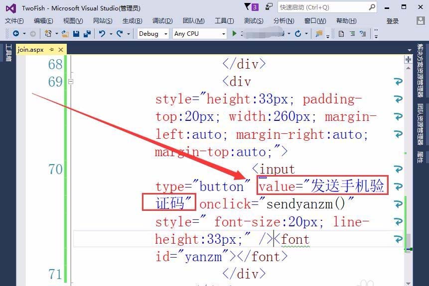5、設(shè)置按鈕的值為發(fā)送手機(jī)驗證碼,即按鈕顯示的名稱為發(fā)送手機(jī)驗證碼。