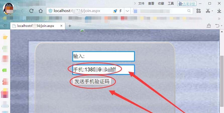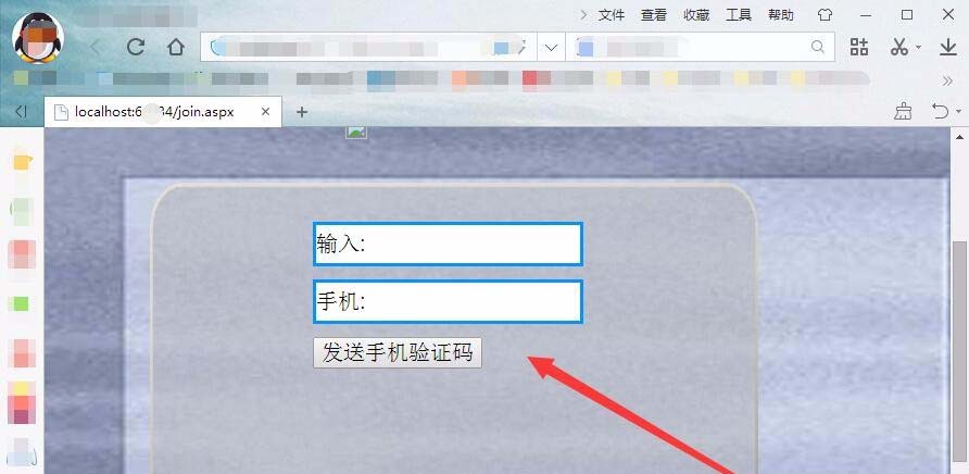 10、運(yùn)行程序,在網(wǎng)頁中成功插入發(fā)送手機(jī)驗證碼按鈕,輸入手機(jī)號后,單擊發(fā)送手機(jī)驗證碼按鈕,就可以向該手機(jī)發(fā)送驗證碼了。