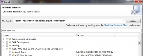 找到Help->InstallNew Software->"Kepler" repository(http://download.eclipse.org/releases/kepler)->Web,XML, Java EE and OSGi Enterprise Development ->JST Server AdaptersExtensions(打勾選上該項)