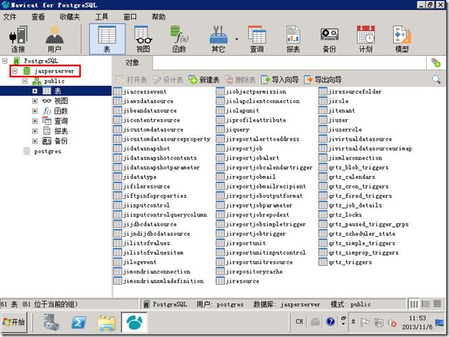 使用數據庫連接工具,可以看到PostgreSQL內已經創建了jasperserver的數據庫