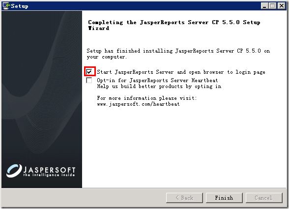 取消下面的勾選,只選擇“運行JasperReports Server并打開瀏覽器登錄”,Finish