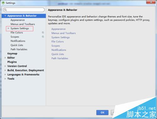 4、進入到了appearance&behavior選項中之后,再次進行選中system settings的選項。