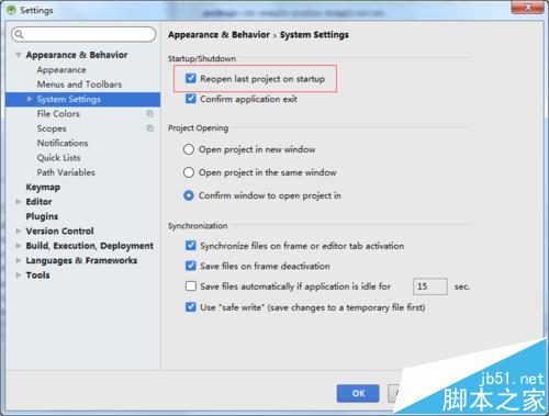 5、進入到了system settings的選項之后,reopen last project on startup的中默認是進行勾選上,所以會自動打開之前的項目的。所以把reopen last project on startup勾選去掉。