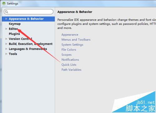 3、進入到了設置的界面中之后,進行選中列表中的editor的選項