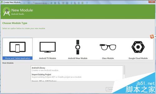 2、然后進入Create New Module窗口。選擇“Phone and Tablet Application”,然后點擊Next。然后一路next,設置module的名字是app2.