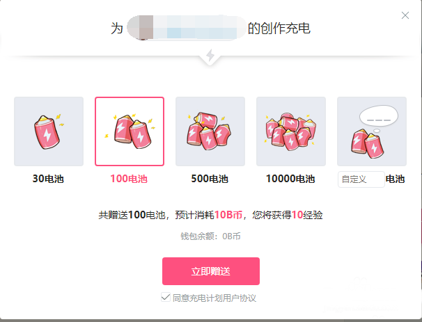 5、最后選擇要充值的電池?cái)?shù)量,點(diǎn)擊【立即贈(zèng)送】就可以為up主充電啦
