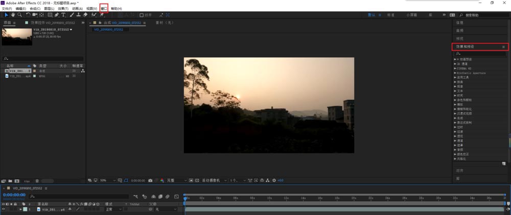 4、點(diǎn)擊右邊的效果和預(yù)設(shè)(如果沒有在左上方的菜單欄中點(diǎn)擊窗口找到效果和預(yù)設(shè),打勾就行了)
