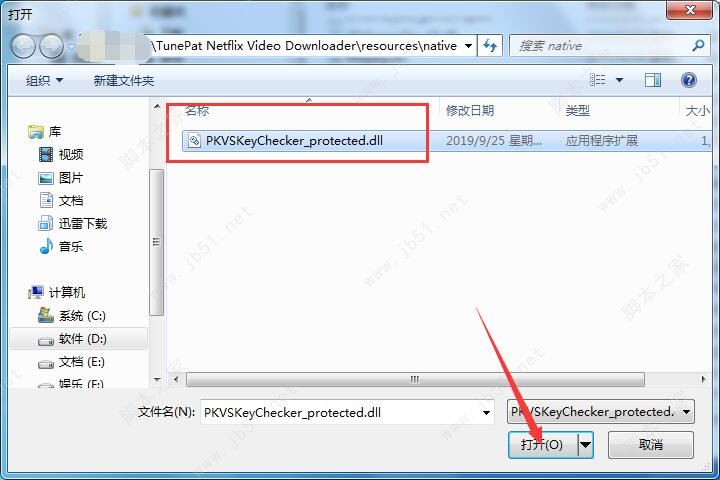 打開TunePat.Netflix.Video.Downloader.1.0.0.Patch-MPT文件夾,將里面的文件復制到軟件安裝目錄,并雙擊“tunepat.netflix.video.downloader.1.0.0-MPT.exe”。點擊注冊機中間的英文,將出現下列彈窗。在彈窗中選擇.dll文件。如圖