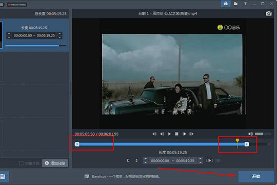 2、在上一步點(diǎn)擊并導(dǎo)入想要裁剪的視頻文件后,軟件將會自動跳轉(zhuǎn)到截取的功能界面,大家可以在左邊的截取列表看到視頻的總長度,點(diǎn)擊某個視頻文件,在右邊出現(xiàn)播放窗口與時間線,其中藍(lán)線就是整個視頻長度,大家可以根據(jù)自己的需要調(diào)整去除片頭與片尾的時間點(diǎn),只需要進(jìn)行拖動紅框標(biāo)注內(nèi)的拖動調(diào)即可,在選擇完成后會在下方出現(xiàn)裁剪后視頻長度,視頻裁剪工作做到這邊就結(jié)束了,下面就是要將裁剪成功的視頻進(jìn)行導(dǎo)出了,點(diǎn)擊“開始”選項(xiàng)即可,如下圖所示: