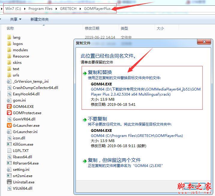 9、打開軟件安裝盤里GOMPlayerPluse文件夾,將剛剛復制的GOM64.EXE,粘貼進文件夾,粘貼時可能會出現以下提示界面,點擊復制和替換即可