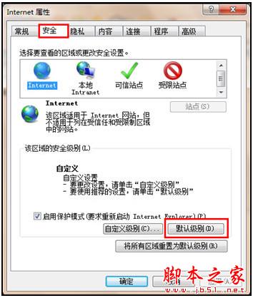 b. 切換到“安全”選項卡,點擊“默認級別”按鈕(若您的按鈕是灰色不可點擊,則您不需要修改這里或者被惡意軟件劫持),IE 會自動開啟 Java 腳本,如下圖所示。