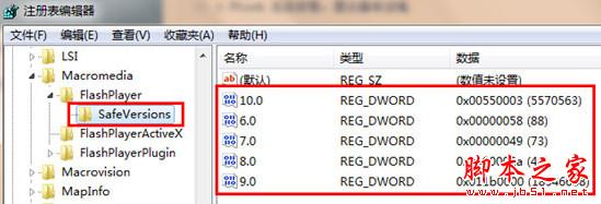 2、將 "HKEY_LOCAL_MACHINESOFTWAREMacromediaFlashPlayerSafeVersions" 內的值刪除(保留默認值)如下圖所示。