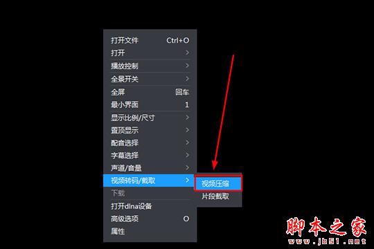 第二步:在暴風影音中播放確認自己下載的視頻是可以正確播放的,在播放的界面中鼠標右鍵進行點擊,將會出現一排可點擊的功能欄目,選擇視頻轉碼/截取其中的“視頻壓縮”功能,即可開始視頻壓縮的第一步,如下圖所示: