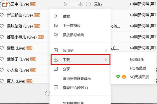 3、找到合適的歌曲音樂之后,在那首歌曲上鼠標右鍵點擊,在新出現的欄目中點擊“下載”,接著選擇一個合適的音樂歌曲品質,當然是越高越好啦,不過SQ無損品質是需要VIP會員才可以下載,如下圖所示: