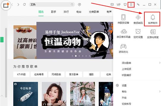 4、下載完畢之后,就可以開始重頭戲啦,點擊右上方的主菜單,在新出現的欄目中點擊“鈴聲制作”選項,如下圖所示: