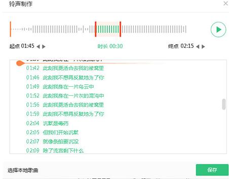 6、將會出現歌曲的歌詞與時長的設置,用戶可以在這里選擇并剪輯歌曲的起點和終點,甚至可以精確到每句歌詞的句子和字眼,在設置完成之后不要忘記點擊“播放”圖標選項進行試聽哦~在完成所有步驟之后就可以點擊保存進行保存啦,如下圖所示: