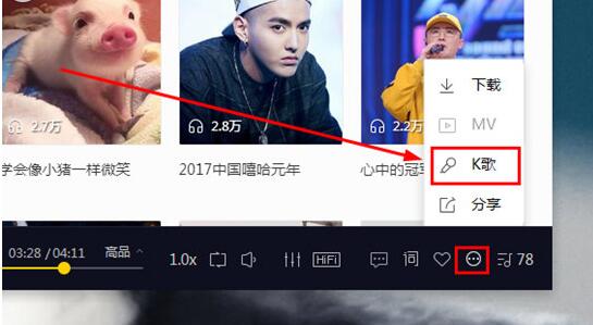 2、點擊右下角的“更多”圖標選項,在新出現的欄目點擊其中的“K歌”選項,即可開始K歌,如下圖所示: