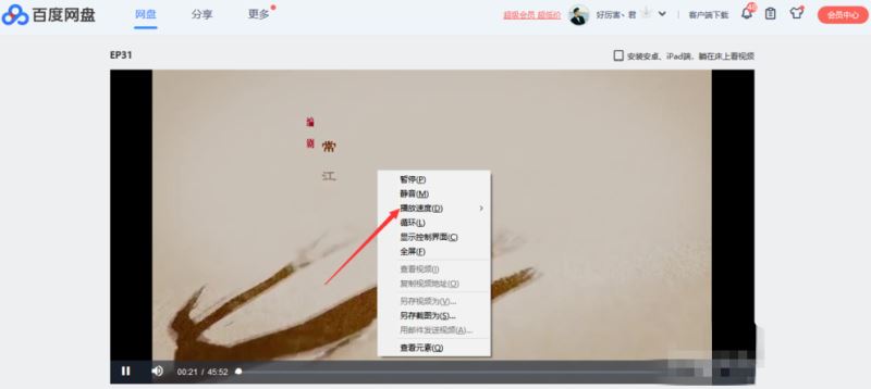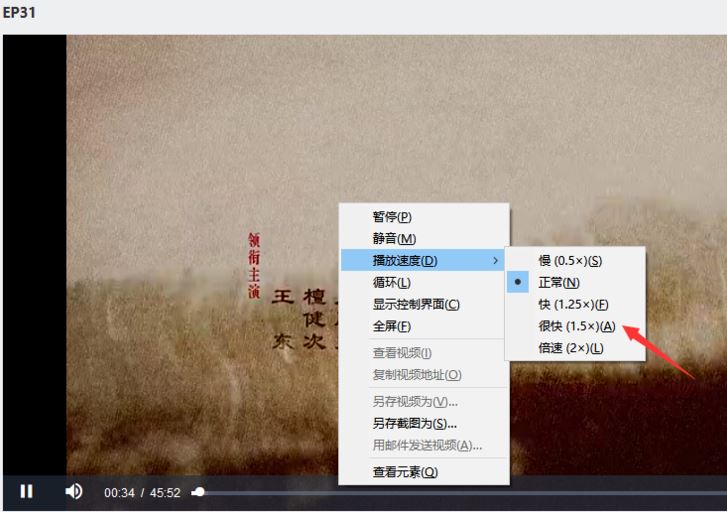 進入視頻播放界面,用鼠標右鍵點擊頁面,可以看到播放速度,點擊它,