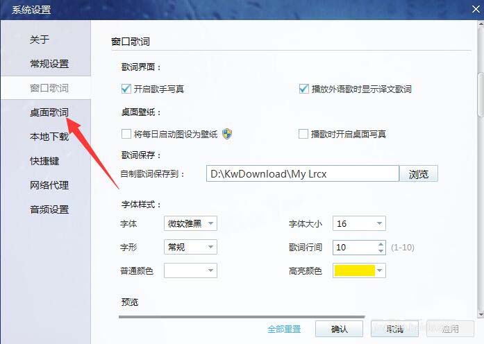 5、在頁面是左側菜單中,我們找到并點擊桌面歌詞,如圖所示。
