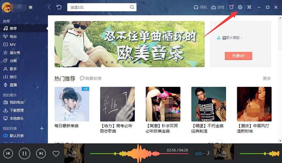 2、在這個酷我音樂當中,我們點擊右側上方的箭頭所指位置,如圖所示。