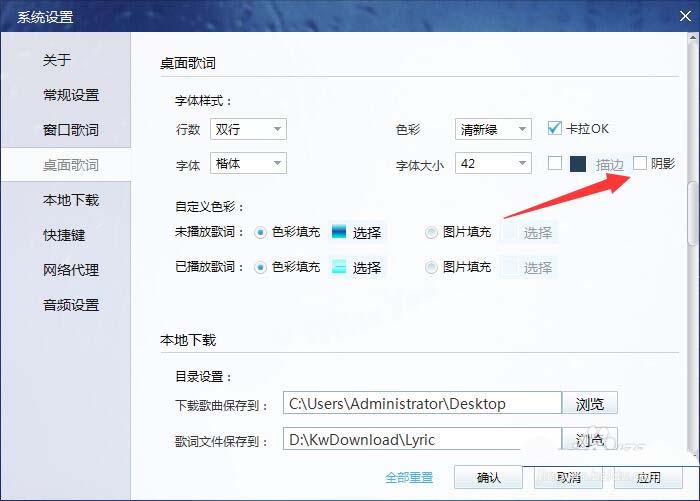 6、在右側的對應桌面歌詞設置區域,我們找到并設置桌面歌詞不為陰影形式,如圖所示。