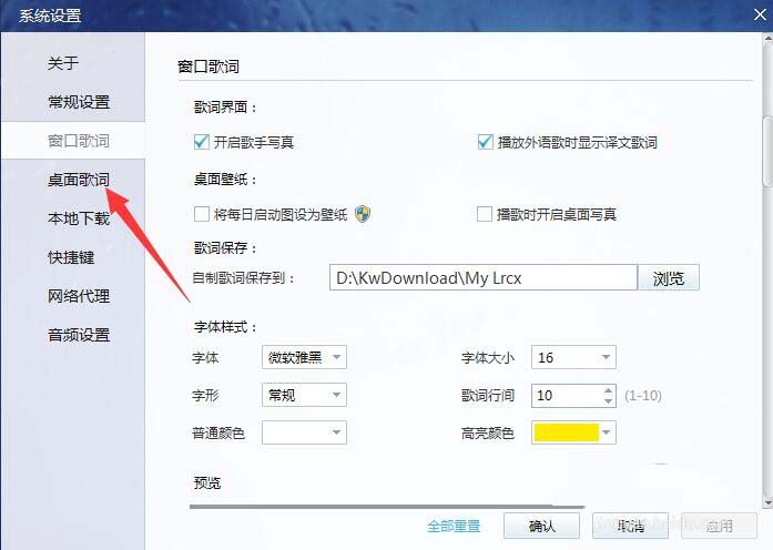 6、點擊桌面歌詞以后,我們會看到行數(shù)設(shè)置的位置,設(shè)置行數(shù)為雙行,如圖所示。