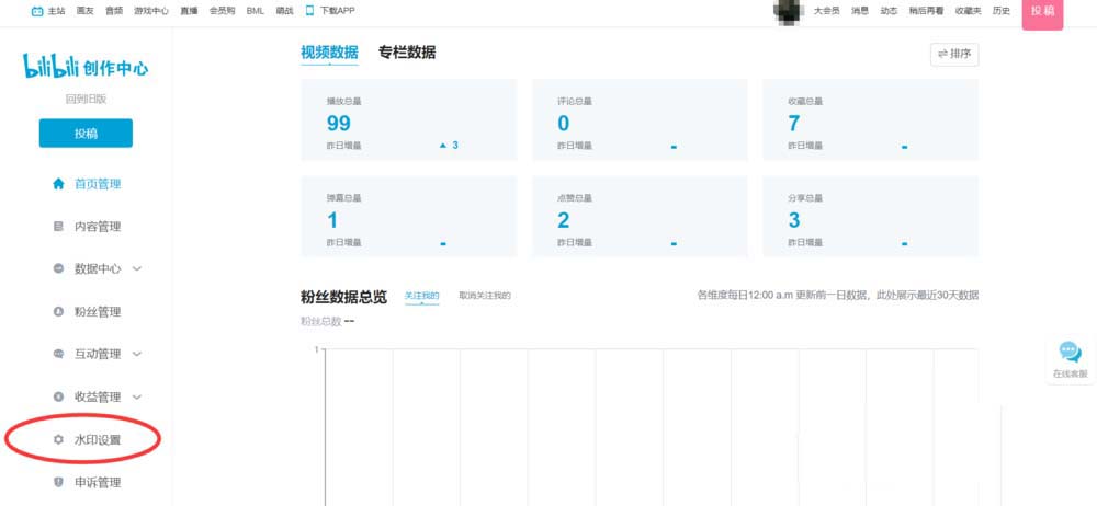 3、接著網頁就跳到了我們的創作中心這邊,在左邊我們能看到很多的功能,我們點擊水印管理