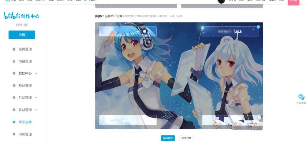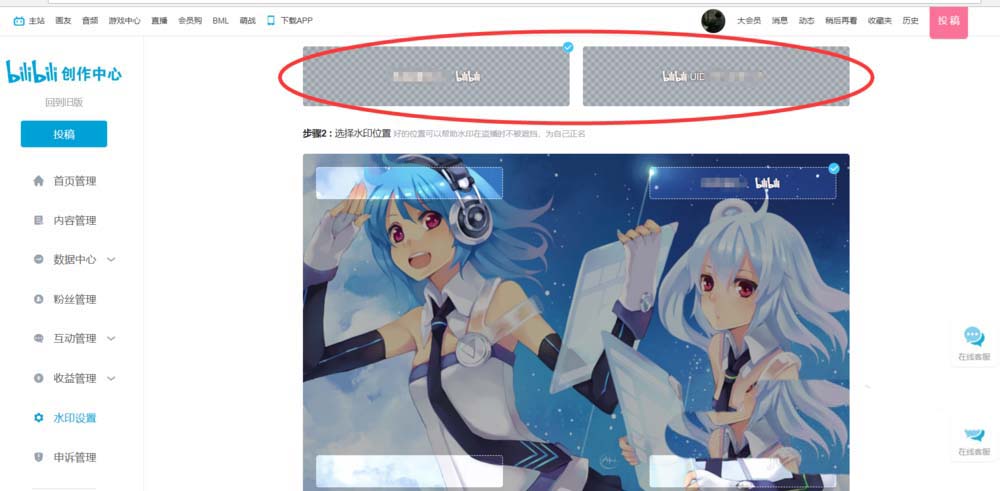 4、在水印管理這邊我們就可以看到我們水印了,主要有兩個,一個是賬號,一個是我們b站的昵稱