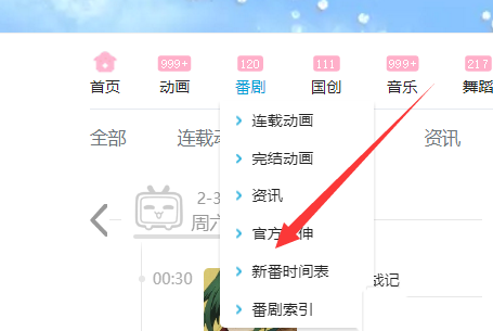 2、我們進入B站,點擊如圖所示的“番劇”,一般來說都是追新番,承包新番,所以我們這里點擊新番時間表。