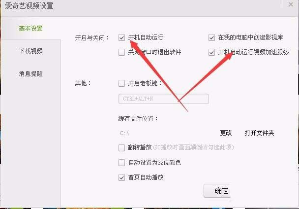 2、在打開的愛奇藝視頻設置窗口中,取消掉“開機自動運行”與“開機自動運行視頻加速服務”前的兩個復選框