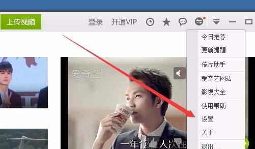 1、在打開的愛奇藝客戶端,點擊右上角的選項按鈕,在彈出菜單中點擊“設置”菜單項
