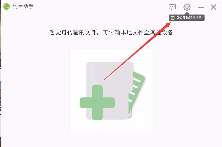 8、這時會打開傳片助手窗口,點擊右上角的設置按鈕,在彈出菜單中去掉“自動連接安卓設備”前的勾選