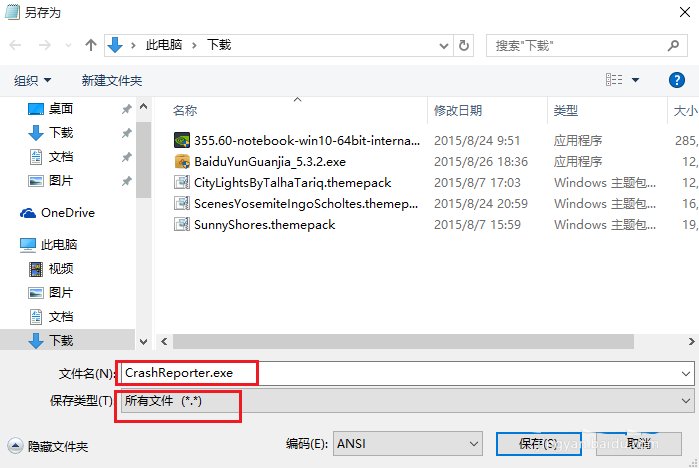 3、新建文本文件,文件名為CrashReporter,選擇另存為,保存時選擇所有文件(注意保存好以后的文件擴展名為exe)