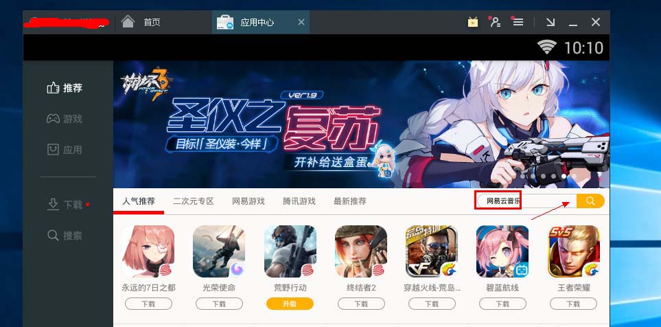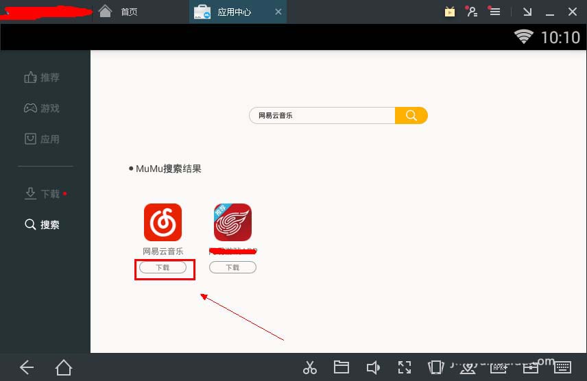 2、進入應用中心,在搜索欄位輸入網易云音樂,點擊搜索按鈕,如下圖所示