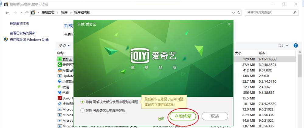 5、現在來到了卸載頁面,這里有兩個選項,這里選擇第一個“修復”,然后點擊“立即修復”