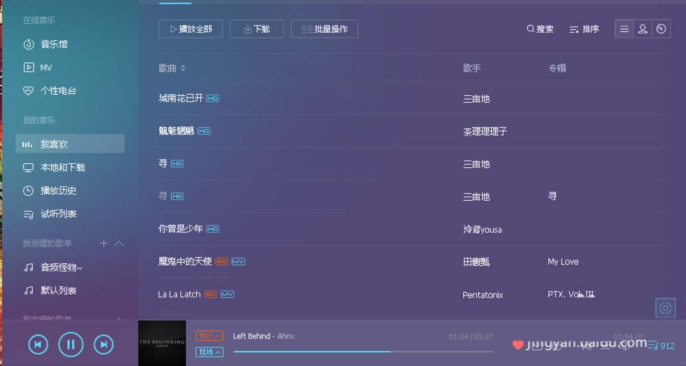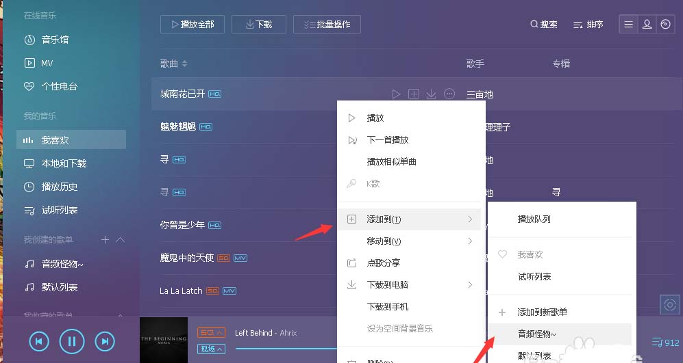 4、進入我喜歡中隨便選擇一首自己喜歡的歌曲,然后點擊右鍵選擇添加到,在選擇添加到我們剛才創建的新歌單中就OK了。