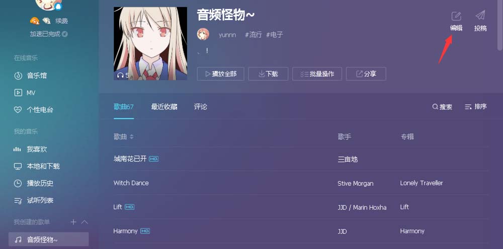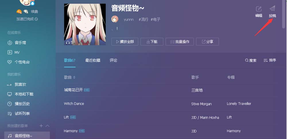 6、只要按照相同的方法將其他自己喜歡的歌曲添加進去就行了,添加完成后就需要完善我們歌單的信息了,如封面,簡介等。編輯完后然后點擊右上角的投稿就可以將自己的歌單發布被別人看到了。