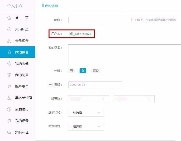 3、用戶名是指的你嗶哩嗶哩個(gè)人中心中的“我的信息”中的。