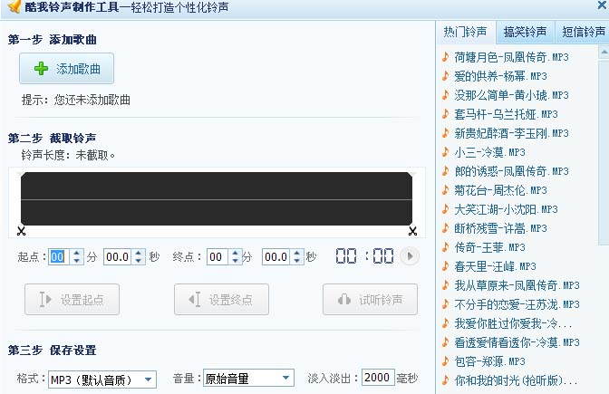 4、單擊”添加歌曲“,然后可以百度一下,制作手機(jī)鈴聲,裁剪好自己的音樂(lè),一定要記住保存的文件夾。同理再裁剪別的一首歌曲。如果需要完整的歌曲,可以跳過(guò)1~4步驟。