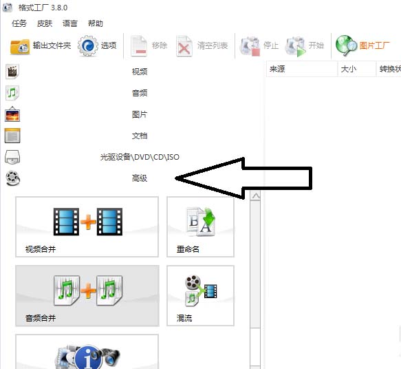 5、打開(kāi)”格式工廠軟件“,單擊”高級(jí)“,如圖。