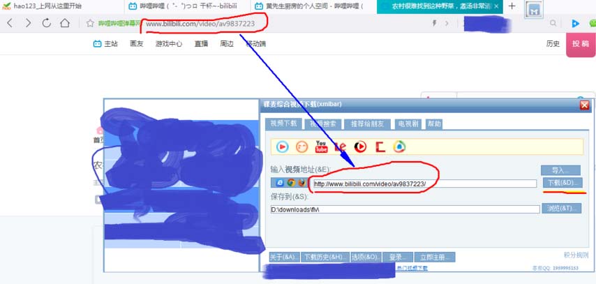 2、這個(gè)使用也超簡單有沒有,只要把視頻的網(wǎng)頁地址復(fù)制到……(額那叫啥我也不懂,你們看圖把),然后在設(shè)置一個(gè)視頻保存的地址,最后點(diǎn)擊下載就行了